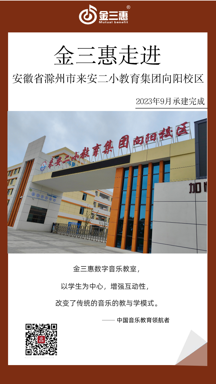 2023年9月,金三惠數字音樂教室為安徽省滁州市來安二小教育集團向陽校區提供、安裝、培訓的常規數字化音樂教室(國標)、合唱教室、管樂教室正式開始使用!配備了金三惠教學系統、電鋼琴、數字音樂教學儀、學生樂器等教學教具。國標室-金三惠 (jinsanhui.com)