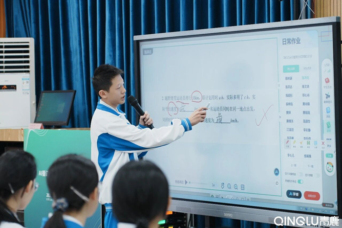 在課例展示環節,新興縣第一中學李麗媚老師以初中數學《從分數到分式》一課展示了融合AI循證與青鹿智慧紙筆技術的精彩課堂。