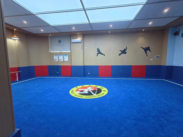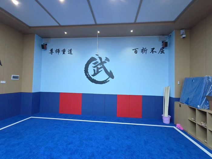 鋪設專業武術軟墊,有效保護學生在翻滾跳躍時免受傷害;墻飾以“武道”渲染,整個空間洋溢著陽剛正氣與紀律感。