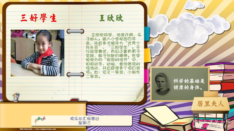 銳美奇電子班牌系統可以實時播放學校的通知,文化宣傳信息,班級課表,作文賞析,活動展示,衛生評比等信息,多元化的展示每個班級的精神風貌。還可以根據學校的具體需求定制開發不同的版本滿足學校的個性需求。 |